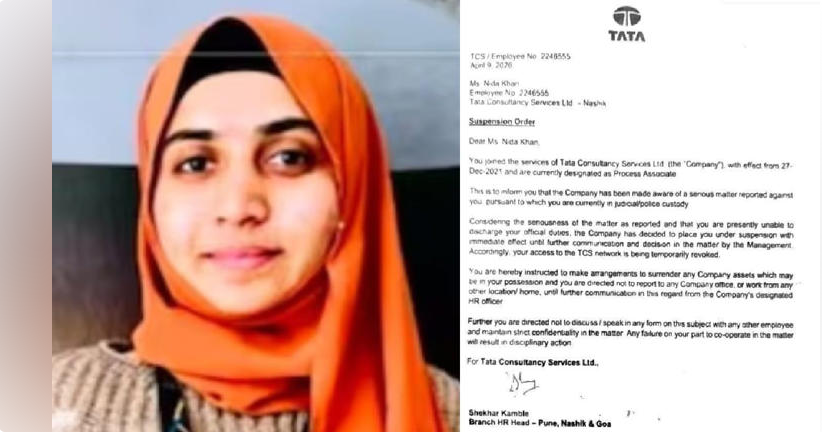நிடா கான் மீது நாசிக் டிசிஎஸ் பெரும் நடவடிக்கை மதமாற்றக் குற்றச்சாட்டுகளுக்கு மத்தியில் இடைநீக்கக் கடிதம் வெளியானது........